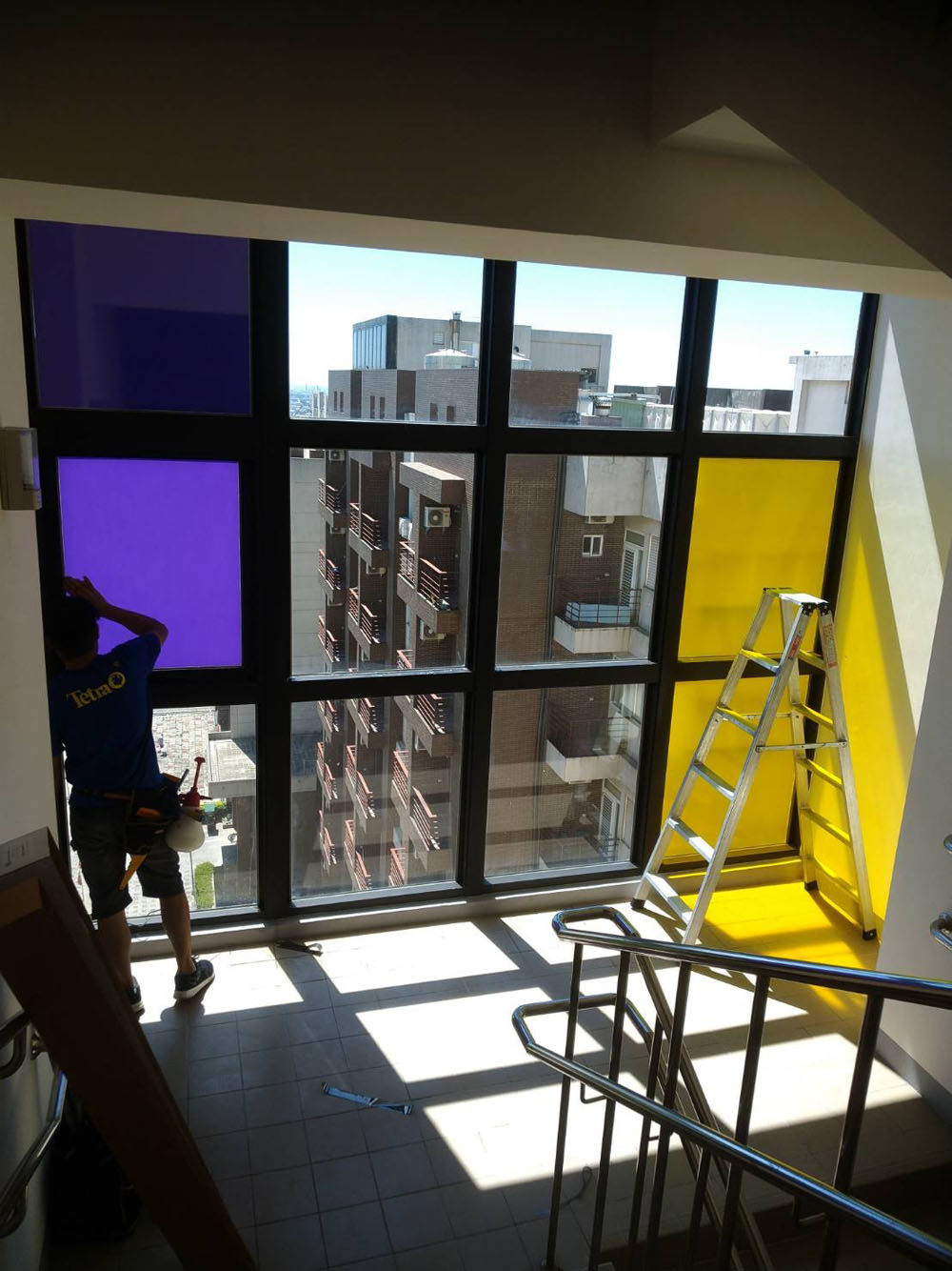 靜宜大學善牧學院本案在隔熱改善之外,亦有空間識別與隱私需求,部分區域需降低外部視線干擾,同時保留採光與提升整體質感,因此規劃上採用彩繪磨砂隔熱紙,讓隔熱功能與視覺設計同步落實。
